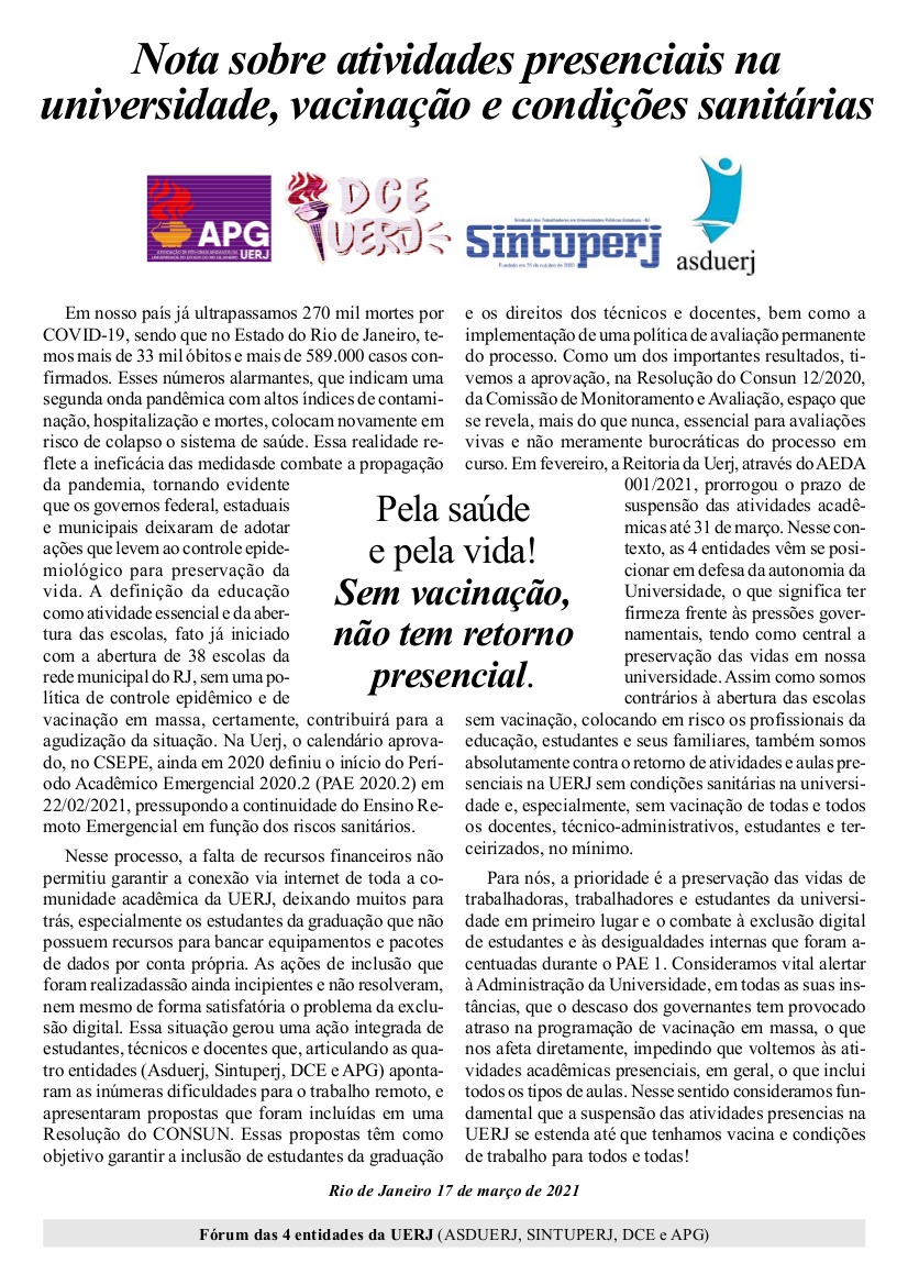 Nesse processo, a falta de recursos financeiros não permitiu garantir a conexão via internet de toda a comunidade acadêmica da UERJ, deixando muitos para trás, especialmente os estudantes de graduação que não possuem recursos para bancar equipamentos e pacotes de dados por conta própria. As ações de inclusão que foram realizadas são ainda incipientes e não resolveram, nem mesmo de forma satisfatória o problema da exclusão digital. Essa situação gerou uma ação integrada de estudantes, técnicos e docentes que, articulando as quatro entidades (Asduerj, Sintuperj, DCE e APG) apontaram as inúmeras dificuldades para o trabalho remoto, e apresentaram propostas que foram incluídas em uma Resolução do CONSUN. Essas propostas têm como objetivo garantir a inclusão de estudantes da graduação e os direitos de técnicos e docentes, bem como a implementação de uma política de avaliação permanente do processo. Como um dos importantes resultados, tivemos a aprovação, na Resolução do Consun 12/2020, da Comissão de Monitoramento e Avaliação, espaço que se revela, mais do que nunca, essencial para as avaliações vivas e não meramente burocráticas do processo em curso. Em fevereiro, a Reitoria da Uerj, através da AEDA 001/2021, prorrogou o prazo de suspensão das atividades acadêmicas até 31 de março. Nesse contexto, as 4 entidades vêm se posicionar em defesa da autonomia da Universidade, o que significa ter firmeza frente às pressões governamentais, tendo como central a preservação das vidas em nossa universidade. Assim como somos contrários à abertura das escolas sem vacinação, colocando em risco os profissionais da educação, estudantes e seus familiares, também somos absolutamente contra o retorno de atividades e aulas presenciais na UERJ sem condições sanitárias na universidade e, especialmente, sem vacinação de todas e todos os docentes, técnico-administrativos, estudantes e terceirizados, no mínimo.