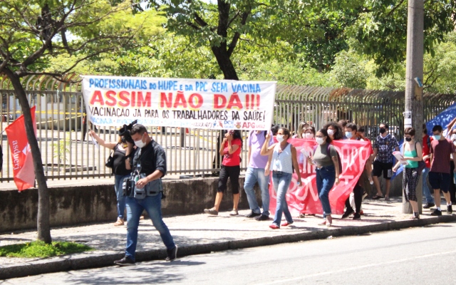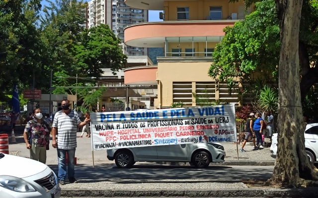 A comunidade uerjiana promoveu na manhã desta quarta-feira, 17/03, uma mobilização reivindicando que todos os trabalhadores da Uerj, em especial os que atuam nos serviços de saúde (Hospital Universitário Pedro Ernesto – Hupe – e Policlínica Piquet Carneiro – PPC), sejam vacinados imediatamente. O ato, que teve sua concentração às 10h em frente ao Hupe, contou com a participação de representantes das entidades representativas da universidade (Sintuperj, Asduerj, DCE e APG), e também de membros da base de servidores técnico-administrativos, docentes e estudantes.