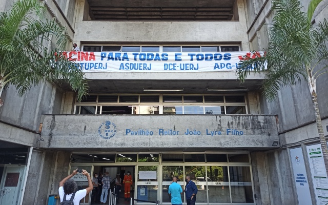 Após o período de concentração, em que os participantes do ato mantiveram um distanciamento seguro e utilizaram o tempo todo máscaras e álcool 70º (as pessoas puderam contar também com a disponibilização desses materiais por parte do Sintuperj), os manifestantes se dirigiram ao campus Maracanã da Uerj e estenderam uma faixa em uma das varandas do pavilhão João Lyra, filho, reivindicando vacina para todas e todos.